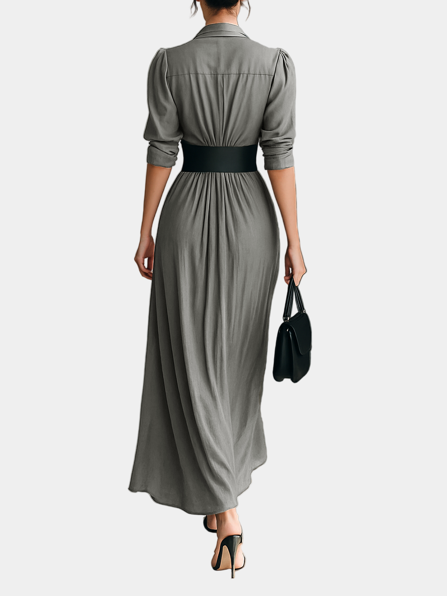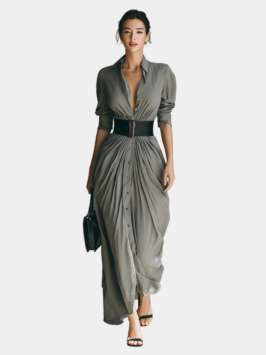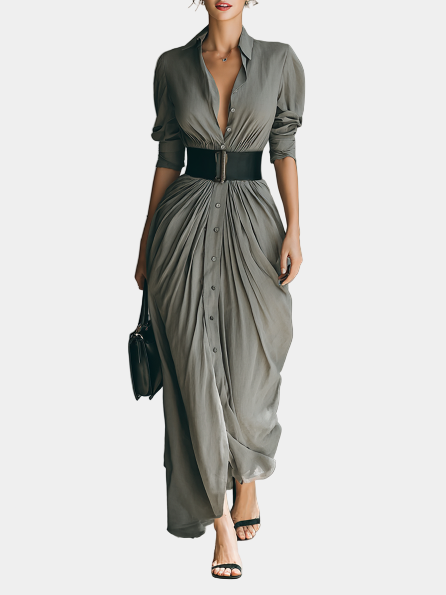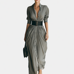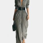 Ο ρευστός σχεδιασμός, οι απαλές πτυχώσεις και η δομημένη ζώνη αναδεικνύουν τη σιλουέτα με μια τέλεια ισορροπία μεταξύ δύναμης και θηλυκότητας. Ιδανικό για όσες επιθυμούν να ξεχωρίσουν με κομψότητα και αυτοπεποίθηση, τόσο την ημέρα όσο και το βράδυ.