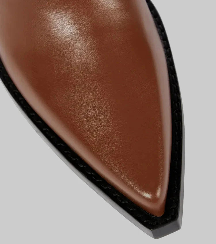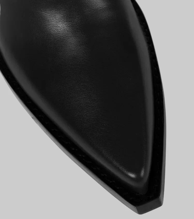 Aparência de Luxo a Preço de Sale : Com a indicação de "Sale" na imagem, pode adquirir o visual luxuoso do couro de cano alto e com salto a um preço acessível, fazendo delas um investnto inteligente em estilo.